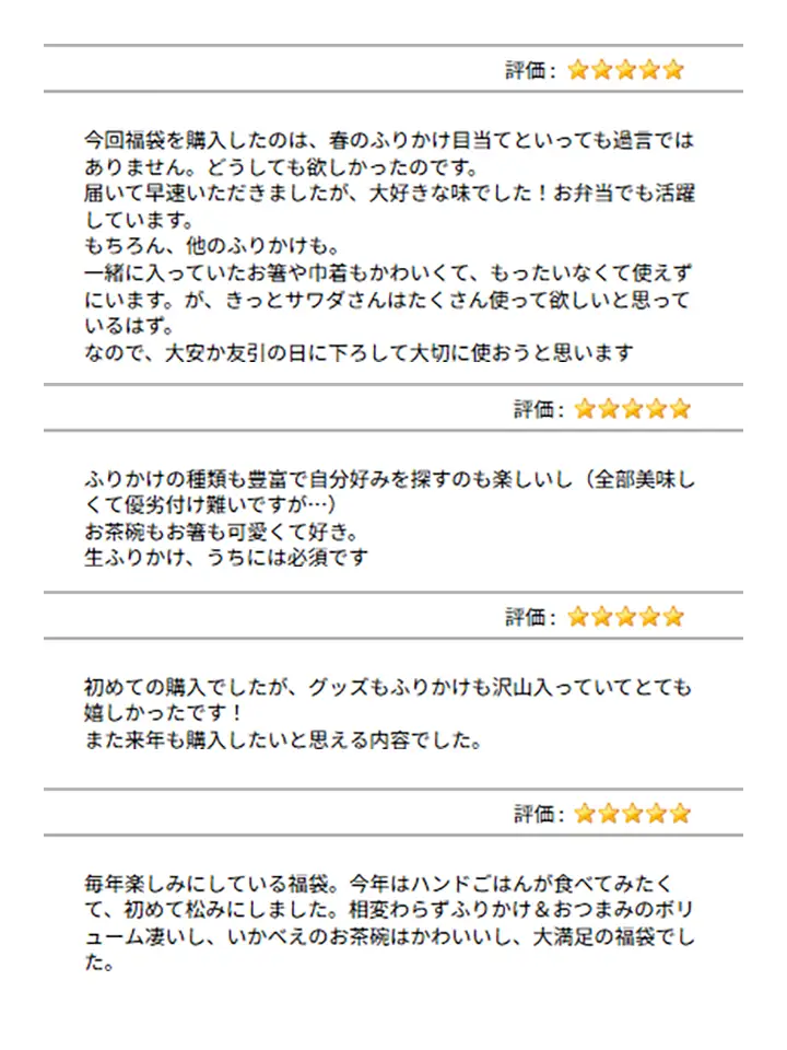 ◆福袋は数量限定販売のため、各セット(松・竹・梅)はお一人様1点限りとさせていただきます。ただし、松・竹・梅の3種類をそれぞれ1点ずつご購入いただくことは可能です。 ※同一種類を2セット以上ご注文の場合は、2セット目以降をキャンセル扱いとさせていただきます。